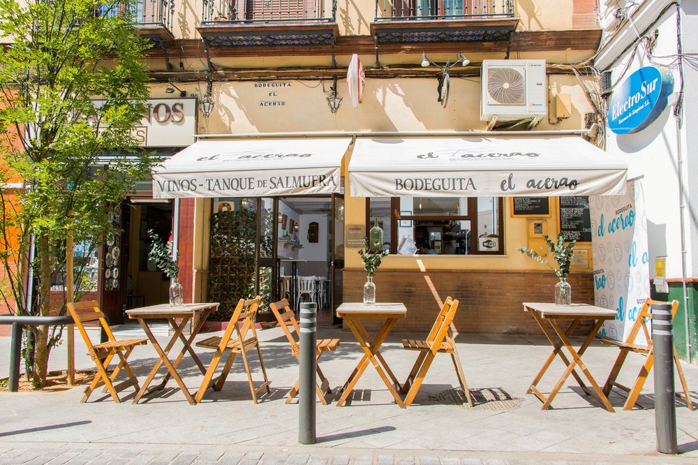 Taberna sevillana renovada en plena Puerta Osario de Sevilla. Bodega de vinos generosos y venta a granel: Manzanilla, Oloroso seco, Cream, Palo Cortao,Pedro Ximenez.. GastroTaberna con oferta gastronómica a partir de productos de quinta gama, quesería,ahumados, montaditos, productos de abacería con montajes casuales con esmero. Cervecería de tanque de salmuera, vermutería.