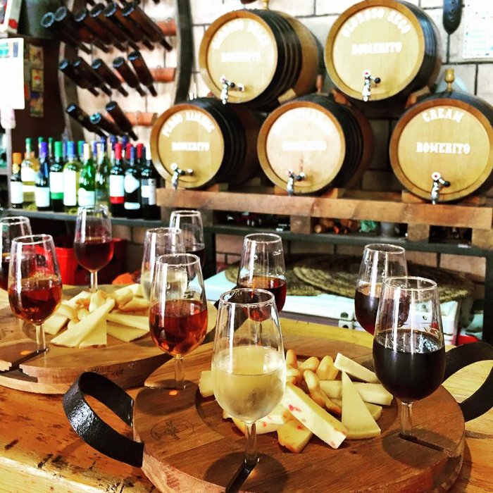 Fino, Oloroso, Cream, Amontillado… se venden por copas a precio de un euro para acompañar alguna de las propuestas que conforman la lista de tapas originalmente pintada con tizas de colores sobre la barra. En la lista butifarra de Chiclana, chicharrones, queso payoyo de Villaluenga, mejillones o un paté de foie.