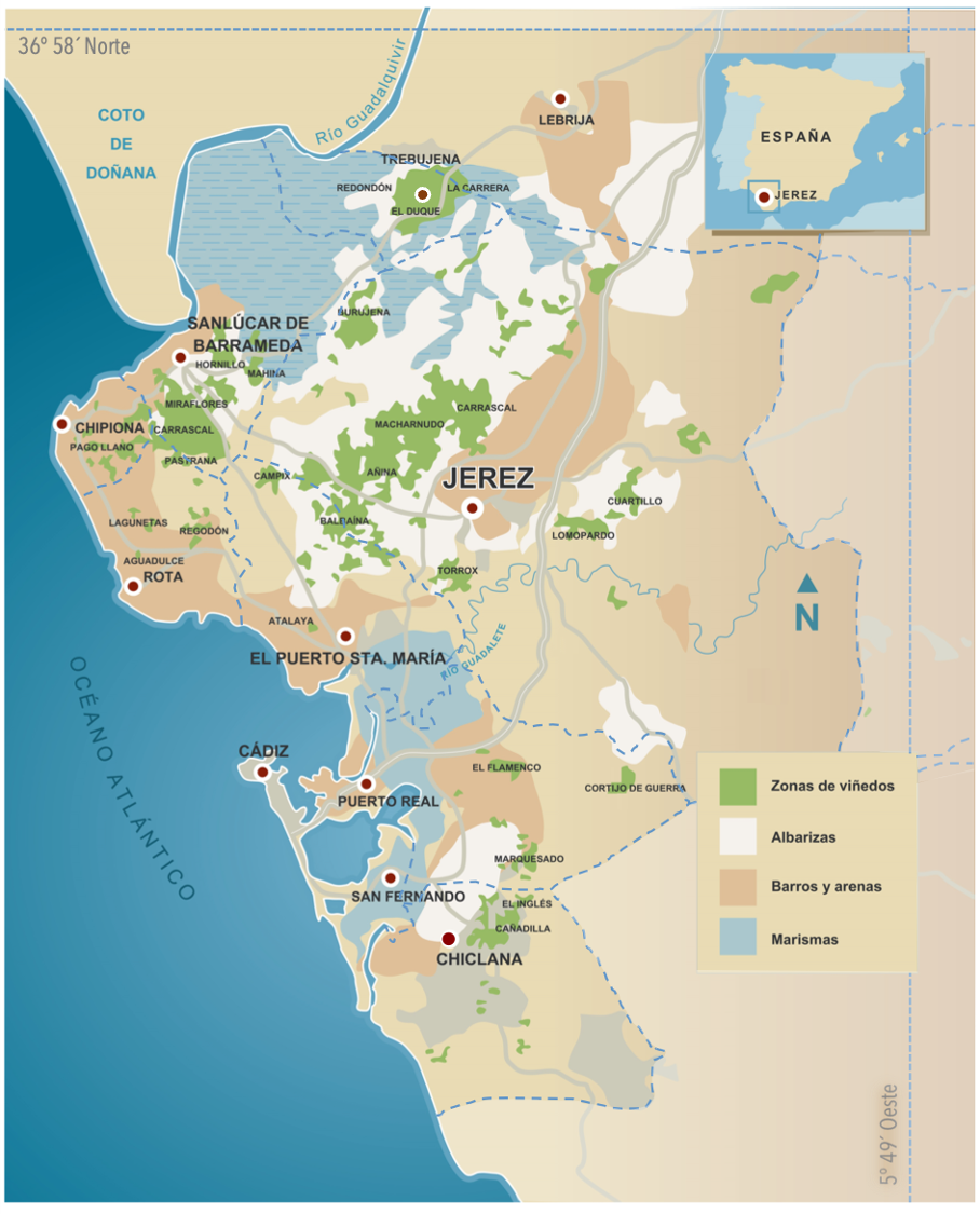 Das Produktionsgebiet der geschützten Weine Jerez Xérès Sherry und Manzanilla - Sanlúcar de Barrameda liegt im Süden der iberischen Halbinsel. Nur in Weinbergen, die sich in den Ortschaften Jerez de la Frontera, El Puerto de Santa María, Sanlúcar de Barrameda, Trebujena, Chipiona, Rota, Puerto Real, Chiclana de la Frontera und Lebrija oder in Landstrichen befinden, die der Consejo Regulador genehmigt hat, dürfen Trauben zur Herstellung von Sherry und Manzanilla angebaut werden. Zurzeit nimmt das gesamte Produktionsgebiet dieser beiden Weine eine ca. 10.000 Hektar große Fläche ein.