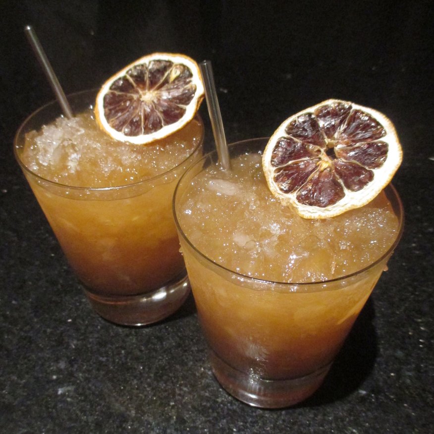 Shake with ice, strain into a double old fashioned glass, fill with crushed ice, and garnish with a dried (or fresh) lemon wheel.
