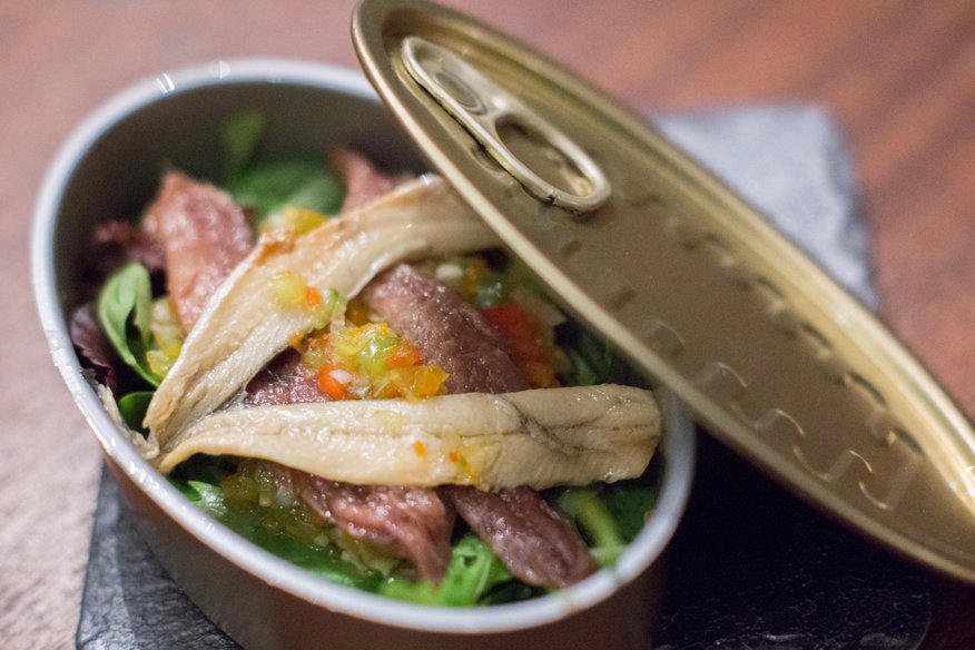 Pour the Viña AB Amontillado of Gonzalez Byass in a glass and enjoy the combination of flavours. The balance between the salty and the sharp anchovies with the aromas of hazelnuts and the slightly salty on the finish of the Amontillado sherry is a perfect match.