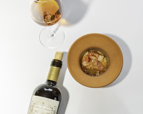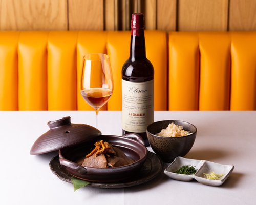 Lengua de buey estofada con soja, daiken, chantarelas, jamón ibérico y arroz al vapor.Maridado con vino Oloroso Tradición VORS Bodegas Tradición.