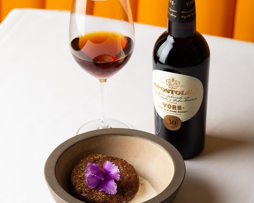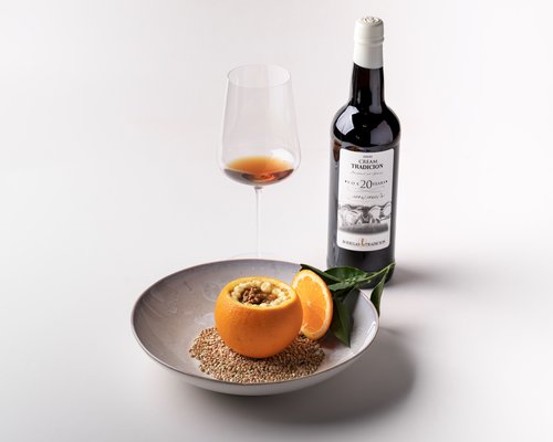 Para finalizar como postre, presentan una simbiosis absoluta de España y Bélgica, un antiguo clásico flamenco, la crêpe Suzette donde la naranja es la protagonista, tanto en la copa como en el plato. Dicho plato es acompañado por Jerez Bodegas Tradición, NV VOS Cream.