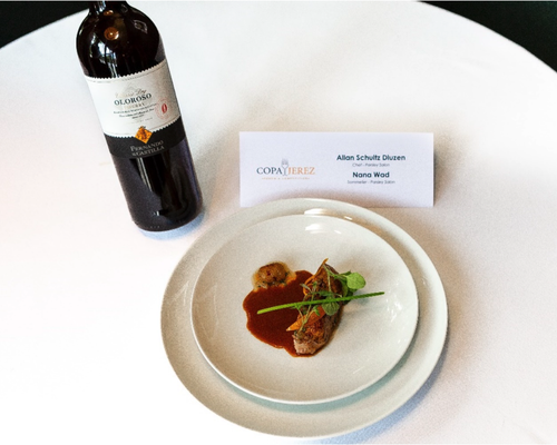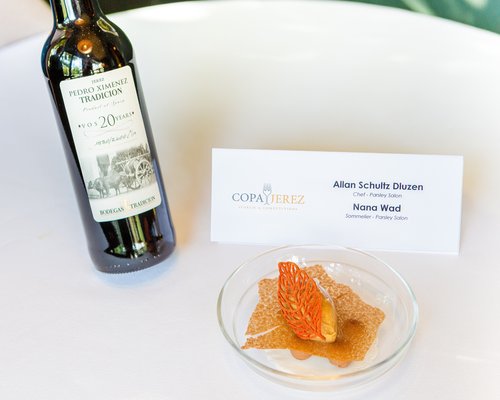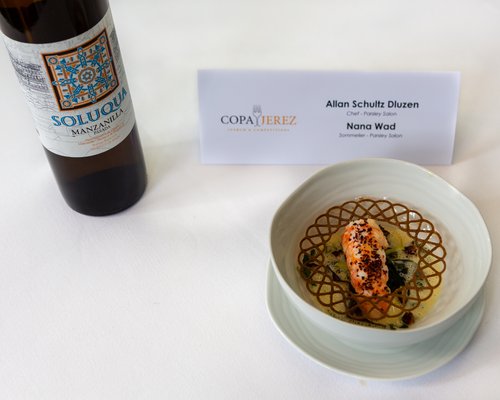 El entrante consiste en Pargo rojo curado, emulsión de shiso, vinagreta de yuzu koji, aceituna y chalota, pimienta rosa en grano.Acompañado de Manzanilla Pasada almacenista Cuevas Jurado de Bodegas Lustau.