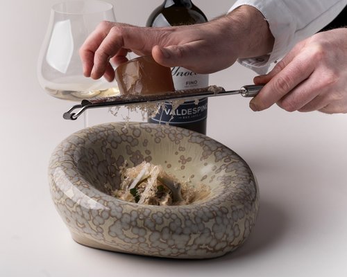 Dos de los productos favoritos de Gianluca, el jerez y la alcachofa, son traídos aquí por Arnout con productos locales de primera calidad. Así eligió que se conformara el plato entrante acompañado por Valdespino, NV Fino Inocente Single Vineyard