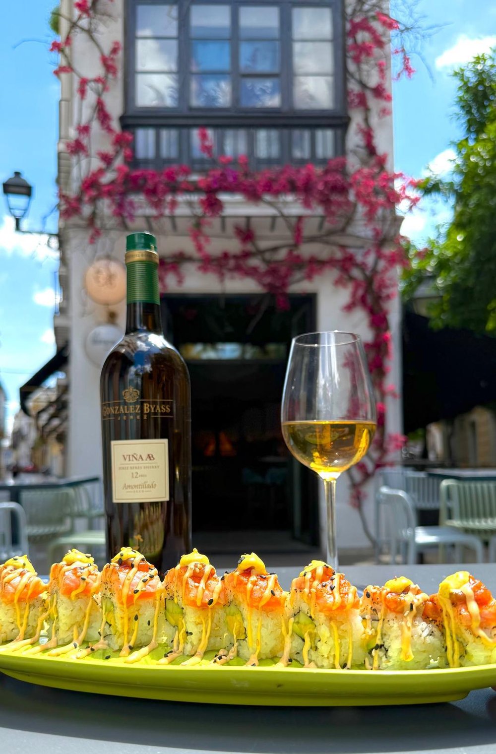 Uramaki la Marujona: aguacate, pepino, tartar de langostino de sanlúcar, salmón ligeramente caramelizado y emulsión de coco con ras el hanu.