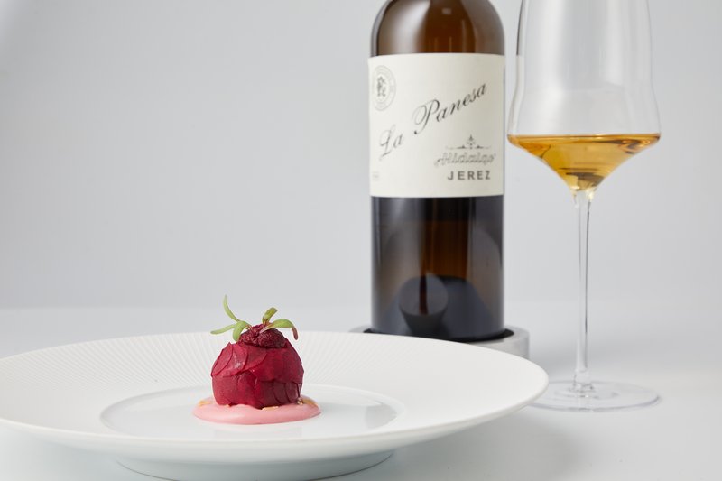 - Como entrante, Escabeche de Codorniz y Remolacha, ingrediente típico del entorno de Peñafiel; que acompañan de la estructura de un Fino La Panesa de las Bodegas Emilio Hidalgo, con la que se equilibra la acidez del escabechado.