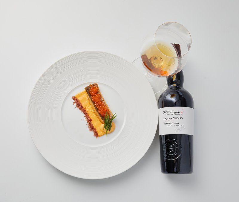 - El plato principal, Adobo con Trucha, Jamón y Halófitas una técnica nacida en Castilla y con gran influencia en la cocina andaluza, que combina a la perfección con el Amontillado 2001 de las Bodegas Williams & Humbert.