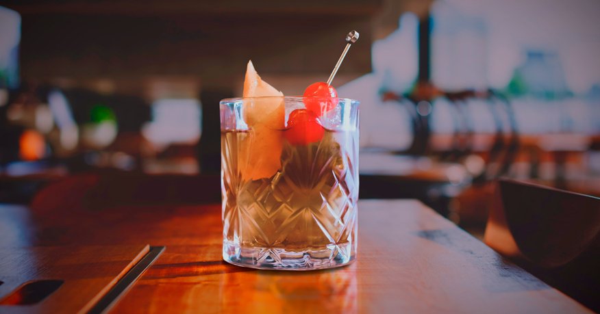 Refrescamos el vaso añadiendo las 2 piezas de hielo en roca dentro y el ron. Con un movimiento sutil y pausado, lo removemos en su propio vaso. Cuando esté listo, se aromatiza con una piel de naranja y termina con una brocheta de guindas rojas.