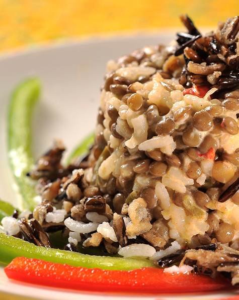 Coloque el arroz cocinado en bol grande y añada poco a poco la salsa, asegurando que quede bien mezclada con una cuchara de madera. Vierta todo en un plato y decórelo con aceitunas negras y almendras.