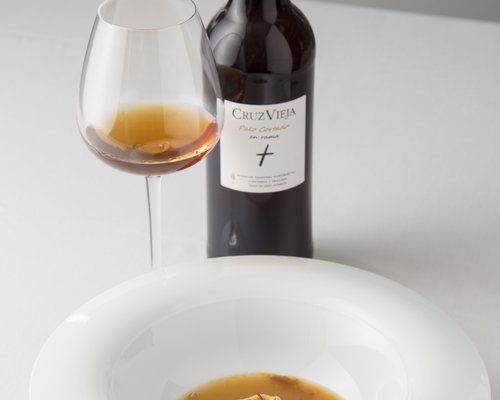 Puede acompañarse de algunos frutos secos, quesos curados y, en la mesa, de consomés bien concentrados, guisos o carnes gelatinosas (rabo de toro, carrillada...)