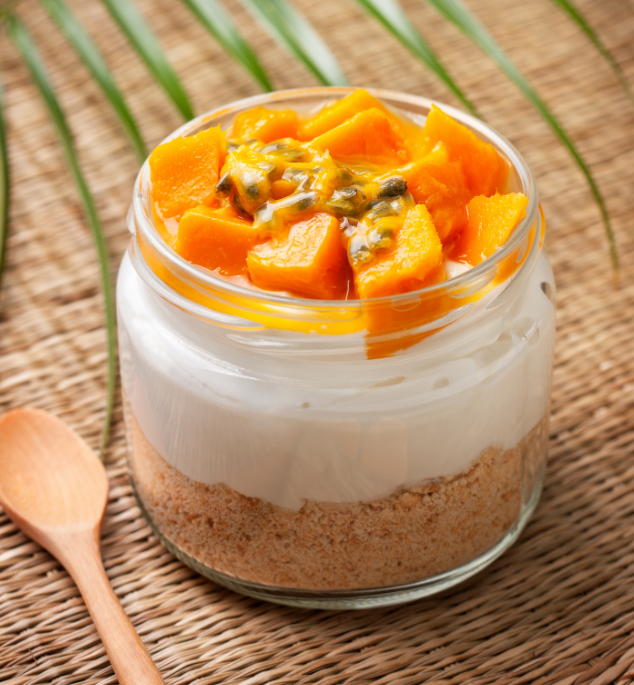 Paso 3: Agregue los trocitos de mango a la mezcla y combine suavemente con la espátula. Colocar la crema en envases individuales o en el aro para hacer una tarta. Refrigere hasta que cuaje 1 hora, y luego proceda a hacer la gelatina.
