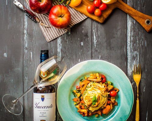 Por su bajo contenido en ácido acético, combina excepcionalmente con platos de acidez destacada (ensaladas con vinagreta, adobos, etc.) así como sopas frías (gazpacho, ajo blanco).