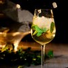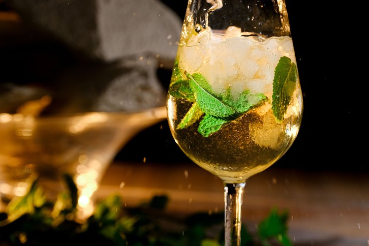 Esta propuesta se basa en el Rebujito clásico y lleva 6 cs hielo pile, 5 gr hierbabuena, 40 ml fino en rama y 100 ml refresco de lima.