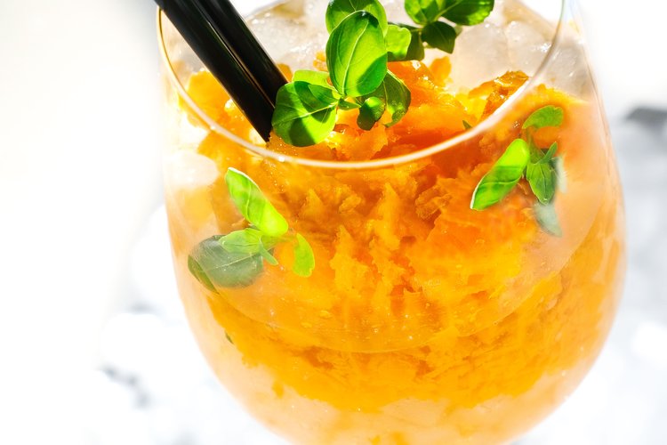 Los ingredientes son 6 cs de hielo pile, 30 ml de manzanilla pasada, 70 ml de soda, 5 gr de hierbabuena, 3 gr de brotes de albahaca y 30 gr de sorbete de mango y menta.