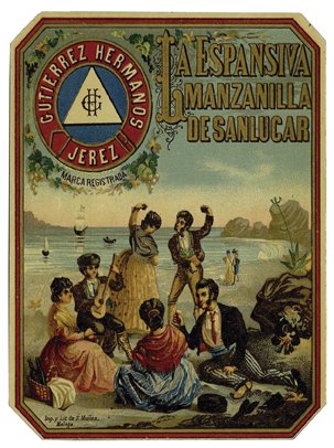 Etiqueta «manzanilla Gutiérrez Hermanos» (entre 1890 y 1920). Litografía F. Muñoz, Málaga. BDH, Biblioteca Nacional de España.