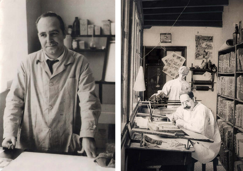 Dcha. . Fotografía de recreación de un taller litográfico. Aparecen, caracterizados, Manuel Rodríguez Gómez y Antonio Panal Iglesias (1963). Archivo familia Juan Montes.