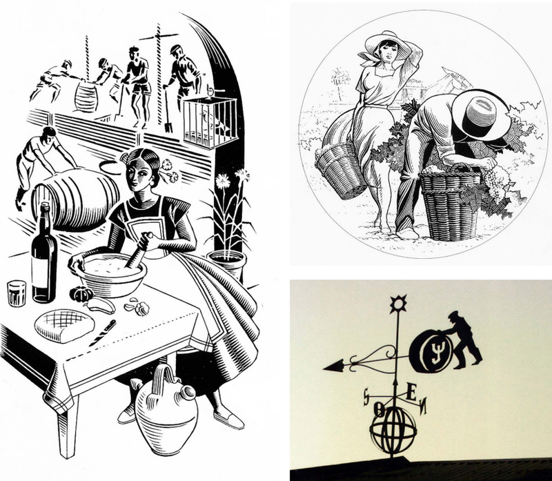 Izq y dcha sup. Manuel Valle, bocetos de etiquetas (s/f). Archivo familia Manuel Valle.
