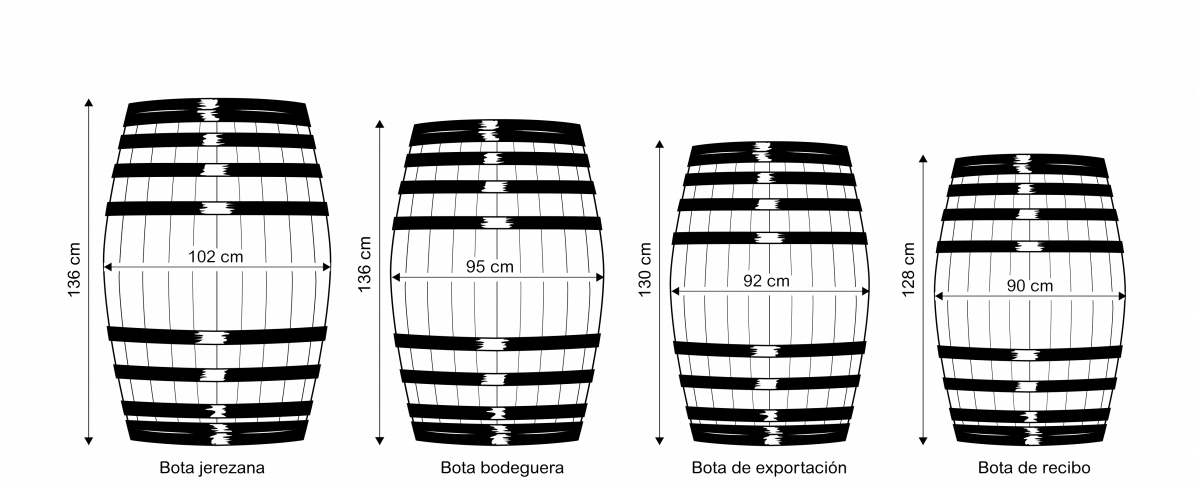 La “bota de recibo”, a la que se ajustaban tradicionalmente las operaciones de compra-venta de vino, tiene una capacidad de 516 litros y unas dimensiones de 128 cm. de talla y 90 cm. de bojo. Finalmente, la llamada “bota bodeguera”, frecuentemente utilizada en los bajos de los sistemas de solera, por su mayor capacidad (566 litros) y resistencia, o en las faenas internas de la bodega, tiene las siguientes dimensiones medias: 135 cm. de talla y 95 cm. de bojo. Aparte de éstas hay otras vasijas que se han utilizado o se siguen utilizando, como la “media bota” de 250 litros, con unas dimensiones medias de 100 cm. de talla y 72 cm. de bojo, el “bocoy” de 700 litros, la “cuarta” de bota de 125 litros y el “octavo” de 62,5 litros.