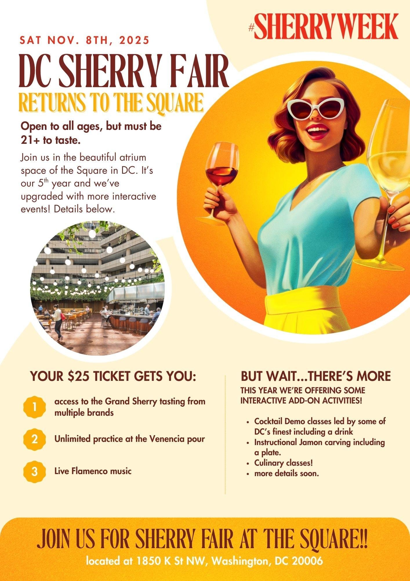 Celebrate Sherry Week in DC with your favorite event: the Mini-Sherry Fair is back for its 5th year. Join us on Saturday, November 8th, from 2 to 5 PM in the beautiful atrium of The Square on K Street, hosted by US Sherry Week Ambassador Chantal Tseng. Your $25 entry includes a walk-around tasting of exceptional sherries, traditional venencia pouring, and live flamenco. (Space is family friendly but folks must be 21+ to taste.) To mark this special anniversary, we’re taking things up a notch with • Sherry cocktail demos featuring some of DC’s top bartenders • A culinary class and book shop • An instructional jamón carving demonstration • Special Guest Nick Africano from En Rama Sherry Co. • And more surprises still to come! Stay tuned for updates. We can’t wait to raise a glass with you.