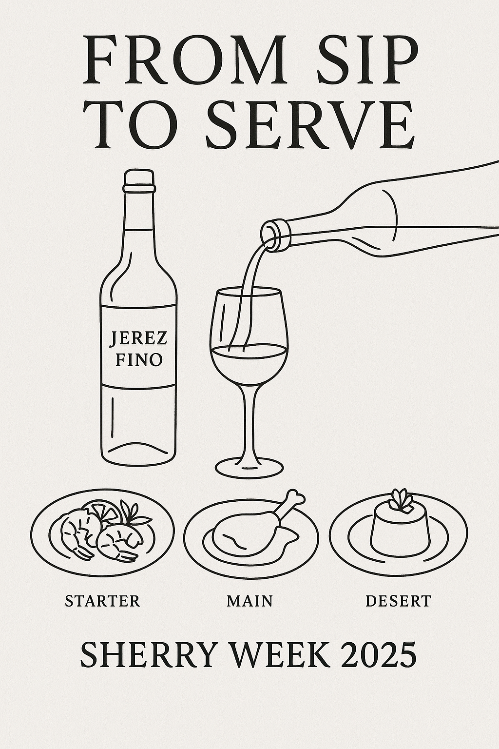 A dinner served with Jerez in all plates and sips. Starting with a drink made with Jerez fino, a starter, main dish and desert all made with Jerez as an ingredient or paired with.