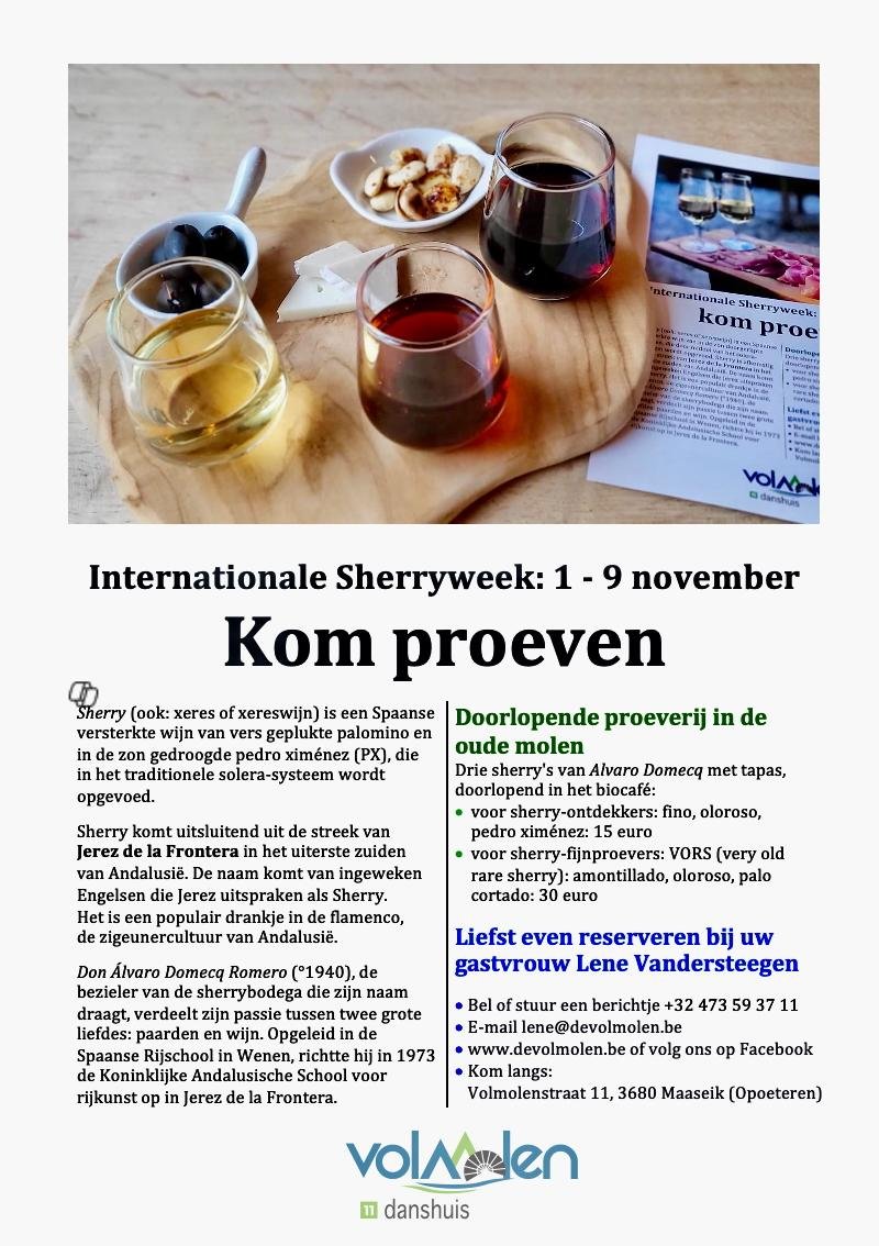 Continuous tasting at the Danshuis Volmolen organic café of three Alvaro Domecq sherries with accompanying tapas. - For sherry enthusiasts: fino, oloroso, and pedro ximénez, €15 - For sherry connoisseurs: VORS (very old rare sherry) - amontillado, oloroso, and palo cortado, €30