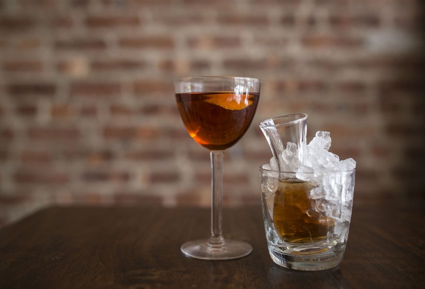 Stir over ice, and strain into a Nick and Nora glass. Garnish with oils from an orange disc and drop into the glass.