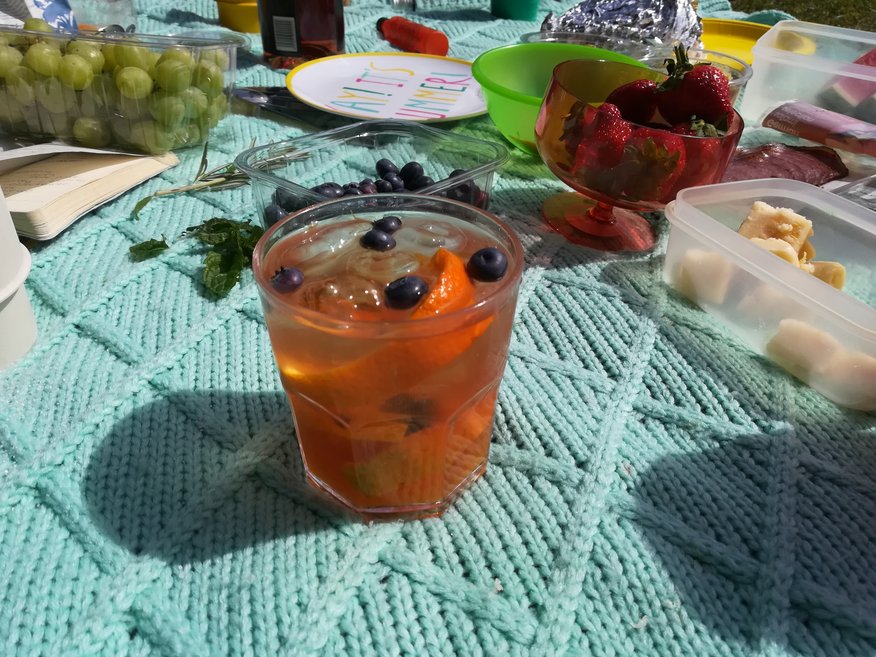 A classic cobbler is normally made without the rosé and the ingredients should be shaken with crushed ice. But it's not convenient to use a shaker during a picnic and nor is it easy to get crushed ice, so this simple option is perfect.