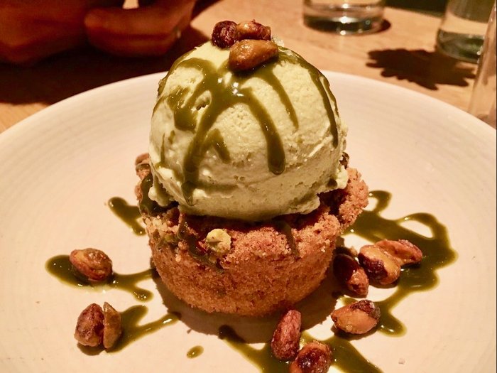 The pistachio crumble is a savory, salty and sweet dessert. It starts with a warm pistachio crumble cake which is topped with our house-made pistachio gelato, covered in a pistachio caramel and served with candied pistachios. It is a dream pairing for an aged Amontillado, with the round nuttiness and just a touch of sweet it was a no-brainer when for Chef Carolynn to pair the two.
