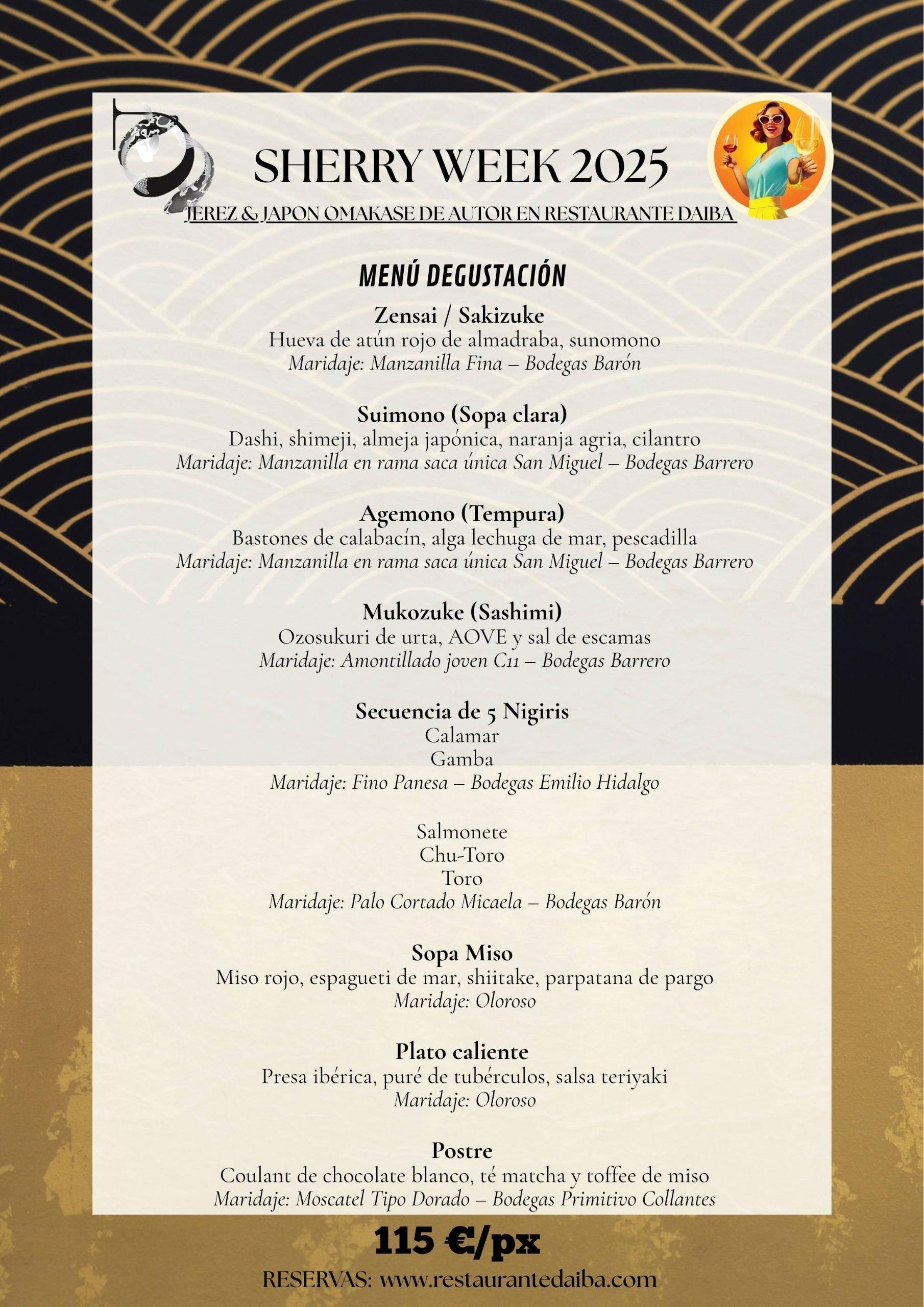 Sumérgete en un exclusivo menú Omakase de 12 pases, diseñado meticulosamente, donde la milenaria precisión japonesa se encuentra con la versatilidad de los vinos de Jerez. Cada plato, elaborado con la máxima técnica, será una sorpresa sublime.