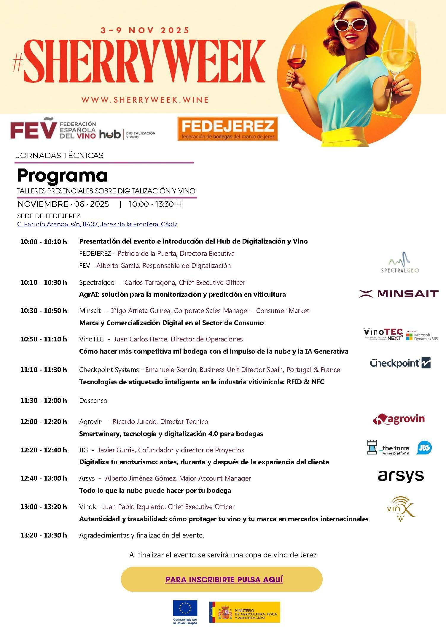 La Federación Española del Vino (FEV) y FEDEJEREZ organizan una jornada de digitalización el jueves 6 de noviembre – en el marco de la Semana Internacional del Jerez, Sherry Week - en la que se mostrará cómo la tecnología puede ayudar a mejorar la eficiencia en diferentes parcelas de la cadena de valor del sector del vino y en la que contaremos con ponentes de toda España.