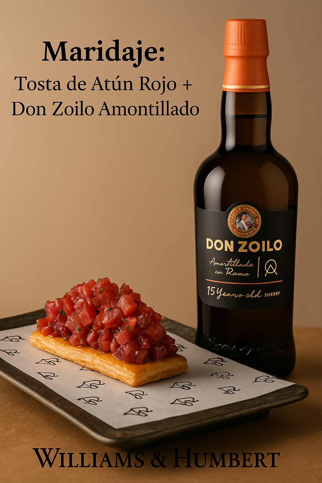 Maridaje de una Tosta de Atún Rojo + Don Zoilo amontillado de la bodega Williams & Humbert de Jerez de la Frontera. La intensidad y la elegancia del atún rojo encuentran su equilibrio natural en la complejidad aromática del Don Zoilo Amontillado. La textura grasa y el sabor profundo del pescado armonizan con las notas salinas y tostadas del vino, que aporta tensión, frescura y un final seco que realza la persistencia del bocado. El carácter oxidativo del amontillado —con matices de frutos secos, cítricos confitados y madera noble— dialoga con la umami del atún y con los toques mantecosos y ligeramente dulces del conjunto, logrando un maridaje de contraste y equilibrio donde mar y bodega se encuentran en perfecta sintonía.