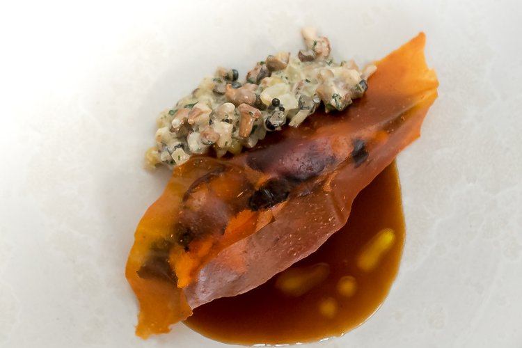 Glazed Iberican pork grilled, served with boletus, black lobster with redcurrant and sweet pepper.