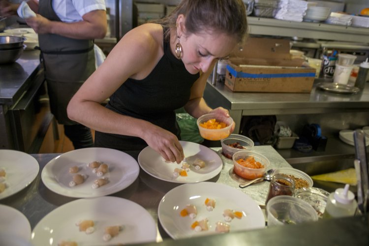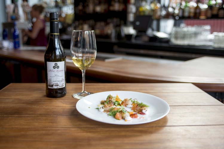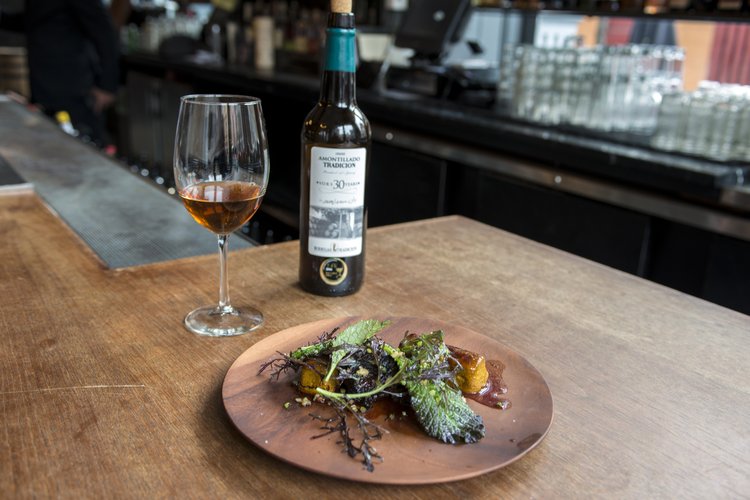- Starter Course: Long Island Bay Scallop Crudo with orange, sesame semolina breadcrumbs, dill oil, Aleppo, pickled ramps & herbs paired with Lustau Fino del Puerto En Rama (2014)