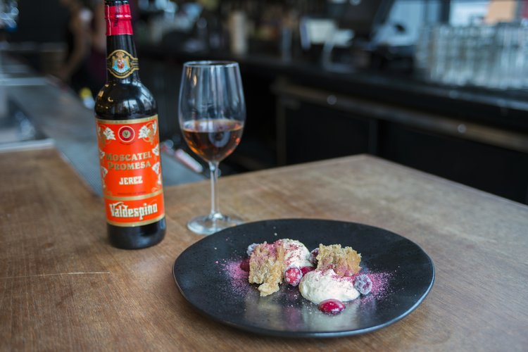 - Dessert Course: Whipped Moscatel Eggnog Anglaise and Texas Peanut Butter Cake with ginger-orange cranberries, sparkling cranberries paired with Valdespino Promesa Moscatel