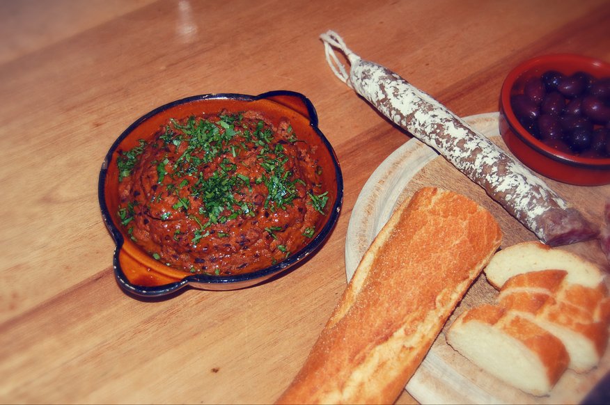 Snijd de aubergine in blokjes van 1 cm. Verhit de olie in een koekenpan en bak de aubergine in 5 min. goudbruin op middelhoog vuur. Snijd de knoflook in plakjes en voeg samen met de tomatenpuree en al-andalus toe aan de aubergine. Bak nog 3 min. Schep de inhoud van de pan over in een hoge kom en pureer met de staafmixer. Breng op smaak met peper, zout en strooi wat fijn gehakte peterselie en olijfolie over het mengsel.