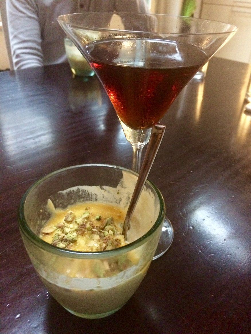 Dan de overige puree erover gieten en bestrooien wat gehakte pistache nootjes.