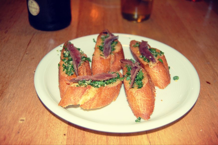 Hak een klein bosje peterselie fijn samen met 1 tenen knoflook en rasp een halve citroenschil. Strooi dit mengsel van peterselie en knoflook op de geroosterde broodjes en leg daarop een ansjovisfiltje.