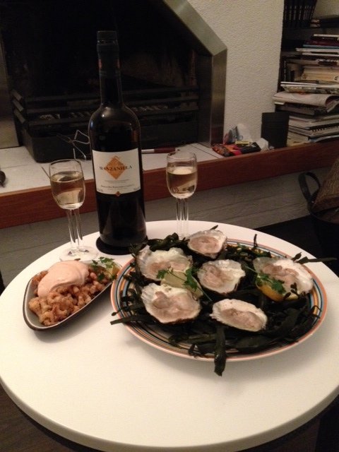 Heerlijke Manzanilla van Bodegas Rey Fernando de Castilla met ziltige Hollandse oesters en Hollandse garnalen !!