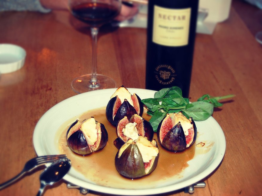 Zet de ovenschaal op het rooster in het midden van de oven en rooster de vijgen in ca. 6 min. goudbruin. Verdeel de vijgen over kleine bordjes. Schenk een eetlepel zoete sherry over de vijg.