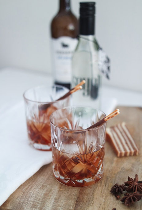Schenk sherry, Crème de cacao en spekkoeklikeur in een tumbler. Even roeren en vervolgens met grote stukken ijs afvullen. Garneren met twee stokjes chocolade mikado.