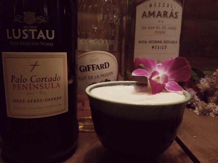 Palo Cortado, Amaras Mezcal, Giffard Passion Fruit, lemon, egg white