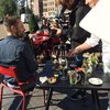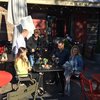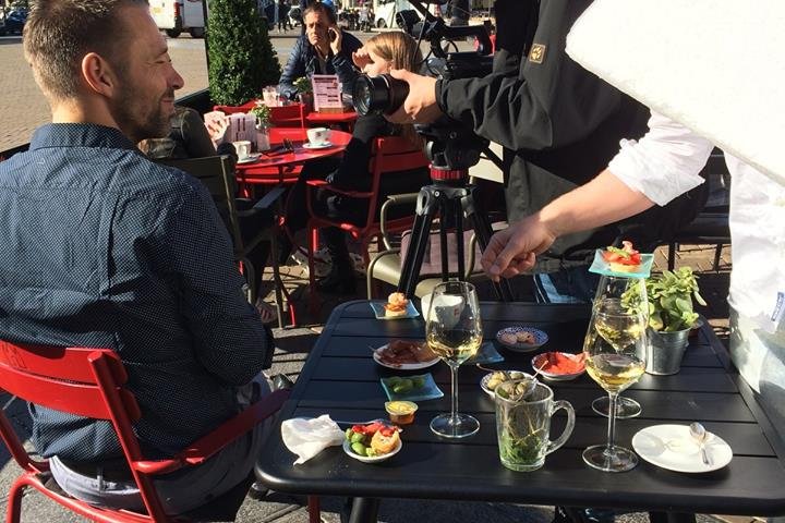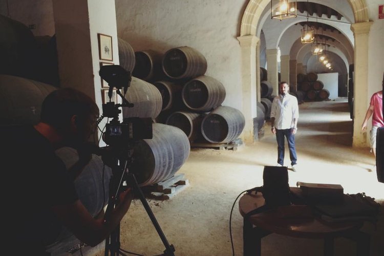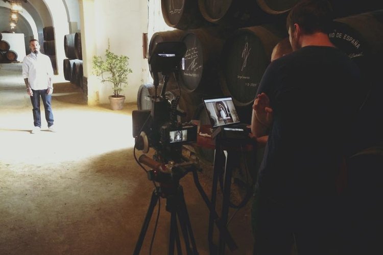 - art director Yuri tijdens de opnamen zijn laatste stukje jamon at, hij is inmiddels vegetarisch en geniet volop van groentegerechten, met een glas Sherry uiteraard.