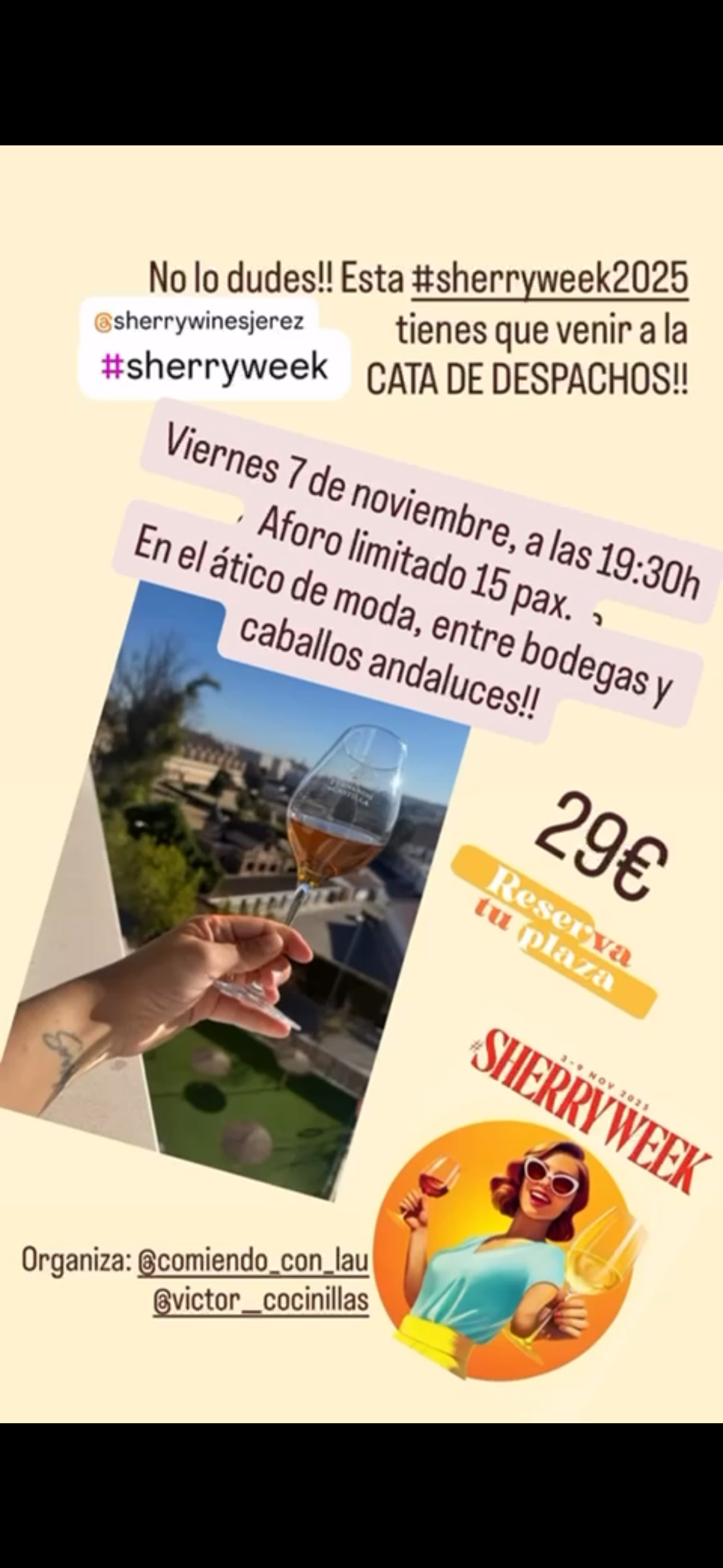 Cata de vinos de despacho, vinos del Consejo Regulador del Vino de Jerez con tapas de nuestra zona. Cata en ático entre La Real Escuela de Arte Ecuestre de Jerez y restos de bodegas.