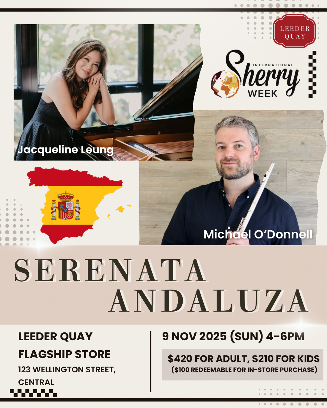 Enjoy the exclusive duet of Hong Kong pianist Jacqueline Leung and flautist Michael O’Donnell, who will take you on an Iberian journey filled with passion and artistry. Delight in a curated selection of exotic Spanish classics, featuring timeless works by Manuel de Falla and Joaquín Rodrigo, perfectly paired with exquisite Spanish sherry and wines, from the sun-kissed vineyards of Spain.