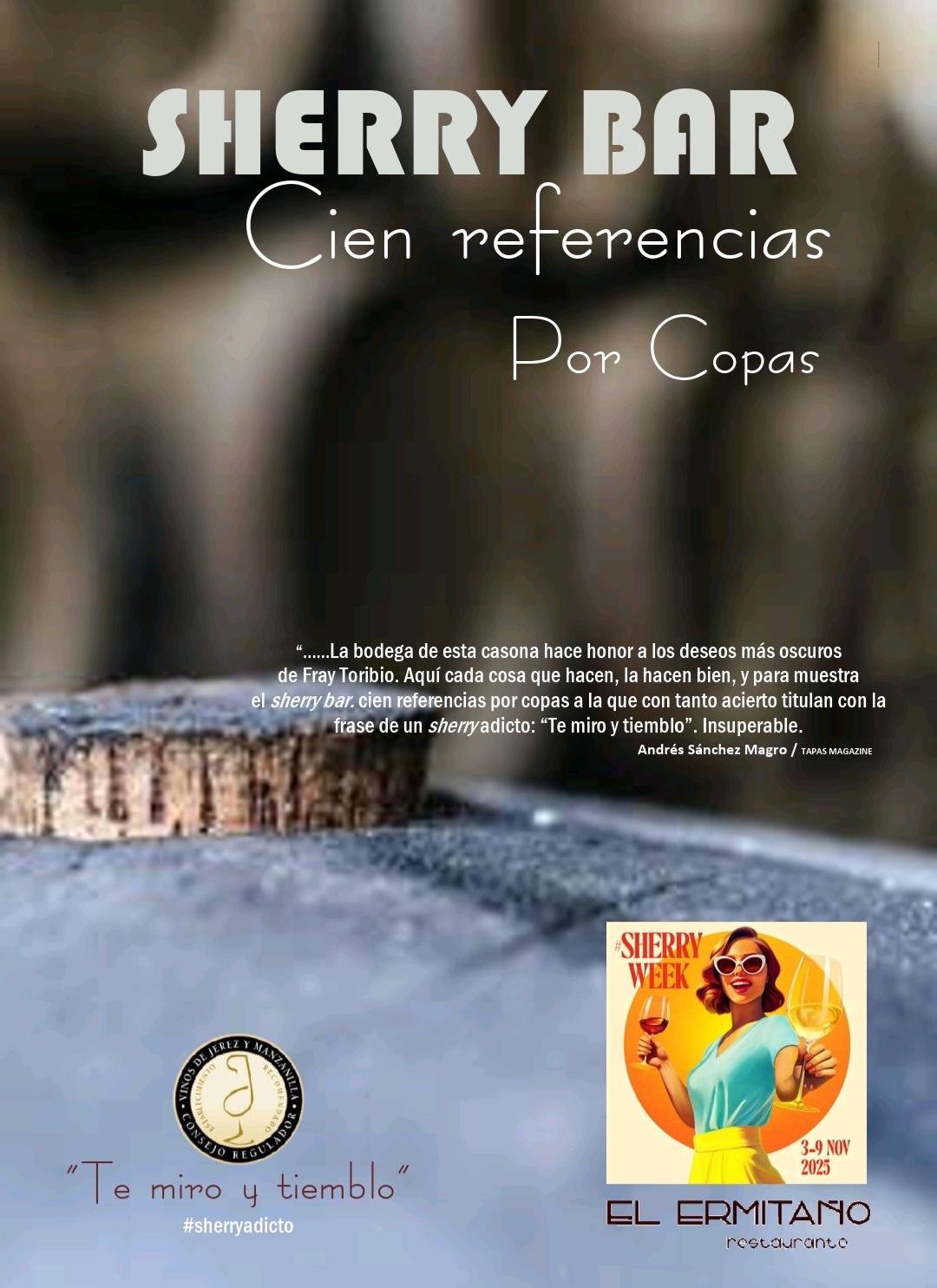 Que mejor forma para celebrar la SherryWeek que copeando. Y para ello en el Ermitaño te lo pondremos muy fácil, con nuestra carta de vinos dedicada a Jerez-Manzanilla de Sanlúcar, que lleva por nombre “SherryBar”, y en la que encontrarás más de 100 razones para celebrar la SherryWeek y disfrutar de los vinos más maravillosos del planeta. Que sepas que nuestra carta por copas de Jerez-Manzanilla de Sanlúcar, el SherryBar, está todo el año “abierto” y a tu disposición, pero si es cierto que durante la SherryWeek Marce descorchará cosas muy chulas, que guarda en su bodega, para tu disfrute. ¿te animas?