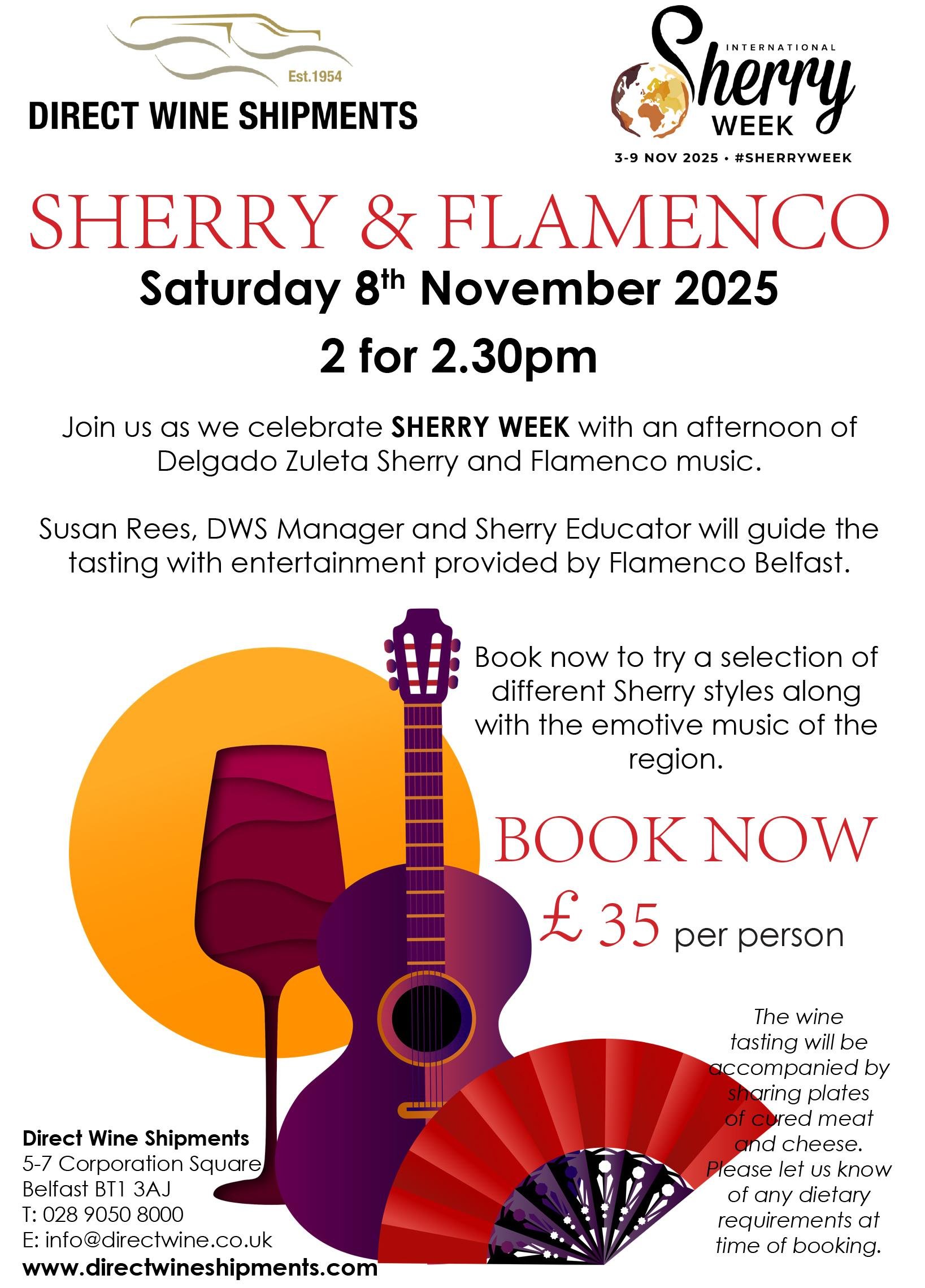 Susan Rees, DWS Manager and Sherry Educator will guide the tasting with entertainment provided by Flamenco Belfast.