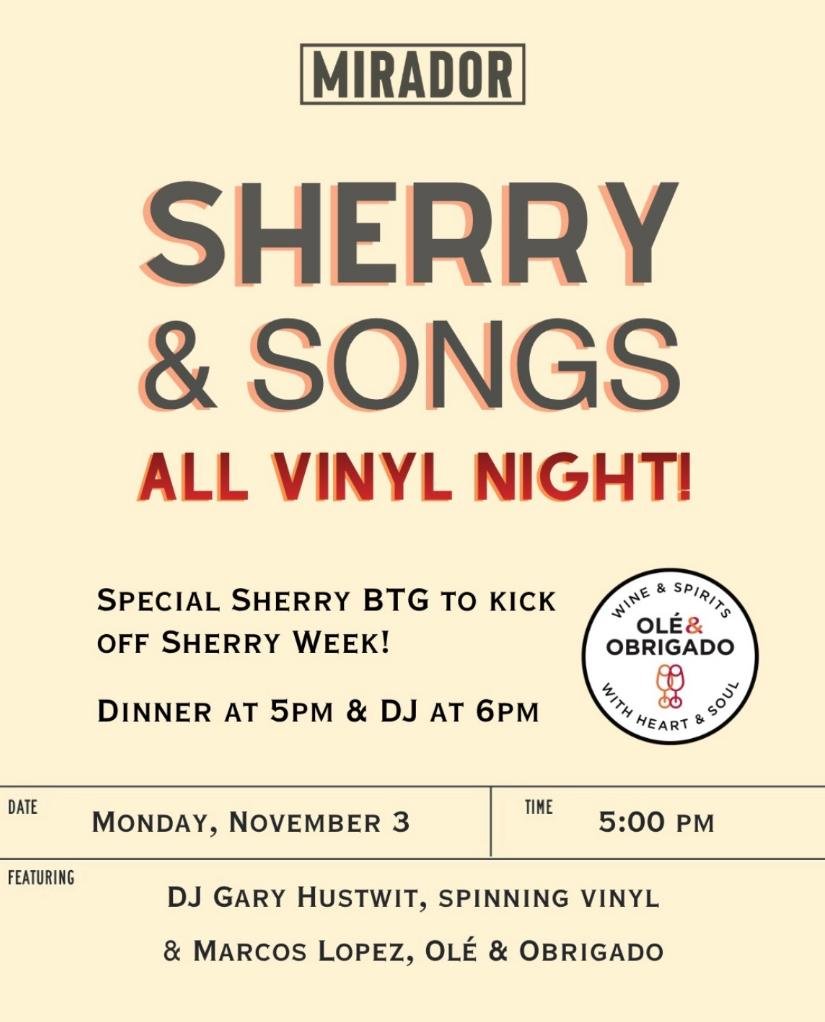 Special Sherry by-the-glass offerings with an all vinyl DJ set.