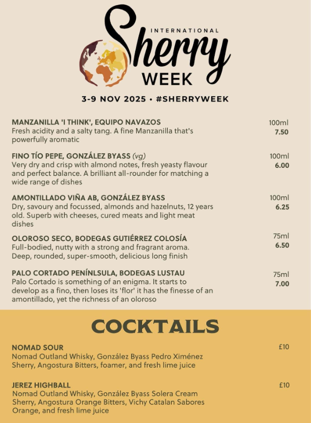 Explore our special Sherry Week wine list, featuring five different Sherries by the glass and two exclusive Sherry Week cocktails.